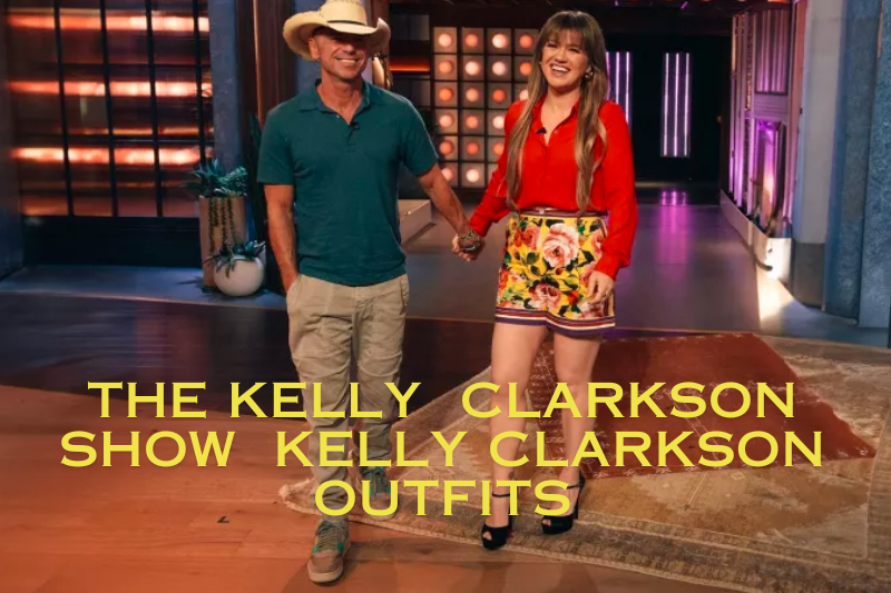Kelly Clarkson in floral print shorts and red shirt outfits