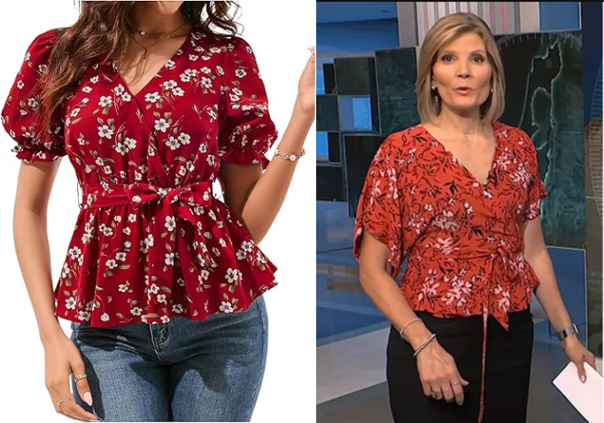 Kate Snow’s red floral wrap top, worn on NBC News Daily, exudes effortless elegance and sophistication. The vibrant red color paired with delicate floral patterns creates a flattering and eye-catching design, making it the perfect blend of style and comfort. Whether dressing for a casual day out or adding a touch of warmth to your work wardrobe, this chic wrap top is a versatile piece that elevates any look.